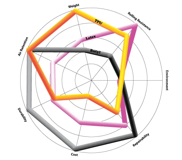 y por la que hay diferencias entre los materiales. Como era de esperar los peores resultados los obtuvo la cámara clásica de butilo, casi doblando los valores de las de látex y TPU. Estas dos últimas en el test quedaron bastante igualadas. Una cámara de TPU de peso estandarizado pierde aproximadamente 0,7 W si la comparamos con una de látex, realmente poco, pero un mundo comparado con los 2,5W si la comparamos con las cámaras de butilo.