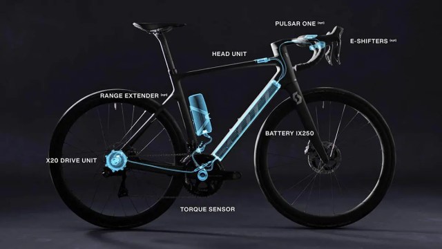 La joya de la corona esta su sistema impulsor situado en la rueda trasera muy ligero con tan solo 1.399 gramos dotado con el sistema AMC (conexión automática del motor) que elimina cables y permite que la rueda se coloque de forma natural, fijándose por un eje de 12 mm. El nuevo sistema compacto de información Head Unit incluye conectividad BT y ANT+, sensor de brillo y acelerómetro 3D ofreciendo toda la información necesaria en una linea para no interferir en la conducción.