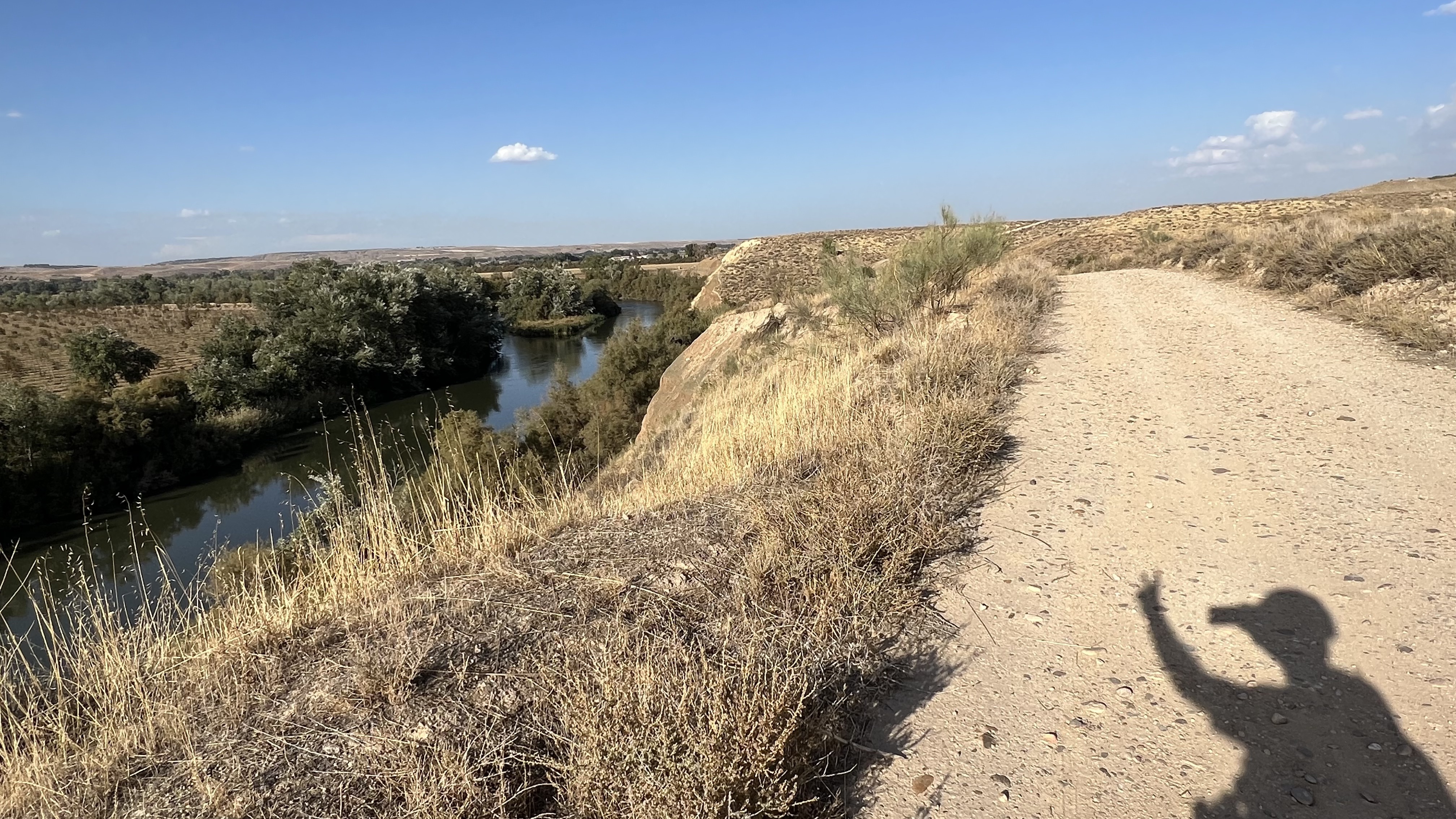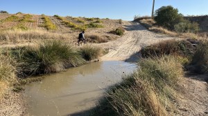 Dejamos el puente de hierro y enfilamos el carril Toledano, pista ancha de tierra, algo polvorienta y traqueada que tenemos la suerte de no compartir con trafico motorizado. Vamos devorando kilómetros, rodando junto a los cultivos de la rivera del Guadarrama. En un gran charco me paso de listo e intento cruzarlo por la derecha. Jorge que es conocedor del truco para superarlo luce su sonrisa de ya bajaras, cuando doy la vuelta me lo encuentro al otro lado de un charco enorme, de aguas marrones fangosas y que tiene pinta de ser muy profundo. Le pregunto cual es la trazada y me dice “ mira a tu izquierda” y cuál es mi sorpresa que veo un paso para sortearlo. El es perro viejo y yo voy empanado.