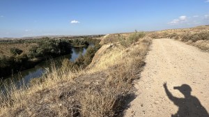 La fuente existe pero el color del agua primero muy turbia para pasar a un marrón agua del desierto nos hace decidir valorar morir deshidratados o de gastroenteritis. Apenas nos quedan 20 kilómetros para llegar a Aranjuez y gran parte o la mitad por carretera lo que dará un respiro a nuestras piernas y culos. Opto por apurar el agua de la mochila, queda poca, muy poca y lo notas en cada sorbo que cada vez cuesta más extraer. Vamos pidiendo la hora, el camino asfaltado y el terminar lo antes posible, ya nos quedan pocas, muy pocas fuerzas.