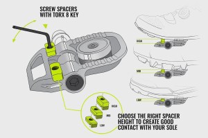 Con respecto a la posición del pie en el pedal, este permite una ligera rotación de la zapatilla y por lo tanto, protege las articulaciones al pedalear. La posición hacia adelante y hacia atrás también se puede variar sin cambiar la fuerza de tracción, por lo que es fácil encontrar la posición ideal tanto para el ascenso como para el descenso.