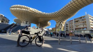 Continuamos callejeando para visitarla la catedral con su famosa Giralda y el entorno típico andaluz con sus coches de caballos que ofrecen un vuelta por la ciudad. Pero nosotros tenemos nuestros corceles y pedaleamos hacia el Guadalquivir para ver la replica de la Nao con la que Juan Sebastián el Cano dio la vuelta al mundo, la torre de Hércules y el puente de san Telmo. Queremos ver la plaza de España pero la organización de una carrera nos impide el paso, demasiada vuelta para llegar, por lo que ponemos fin a nuestra visita buscando la salida de Sevilla por la Puerta Verde.