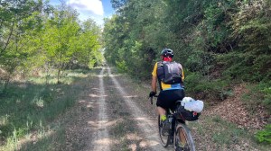 El camino a tramos está más acondicionado cuando han decido aunar pista lateral y vía. En uno de los tramos de los más malos de esta etapa el balasto a un hace acto de presencia siendo incomodo de rodar, por primera vez desde que montó la alforja de horquilla, está sale volando, la verdad, estaba mal puesta, culpa mía.
