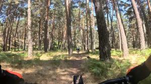 La senda por la que nos mete el lugareño es simplemente deliciosa, fácil de rodar, sin una pendiente demasiado exigente y disfrutando del bosque de pinos, de un mar de helechos y de los juegos de luz entre las sombras que tan bien quedan en las tomas de la cámara.