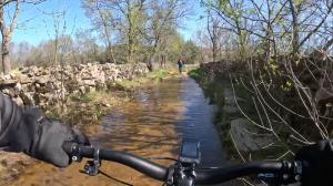 El Camino de Mangirón además de bonito es muy húmedo y en parte no le falta a razón a Jorge cuando dice que la zona drena bien a pasar de parecer un auténtico pantanal, es porque nos permite rodar sin que el barro atore nuestras ruedas, pero bueno lo de rodar en ocasiones se volvía un eufemismo. Pero cuando lo que hay son ganas de disfrutar las dificultades se pasan con humor y terminas disfrutando del momento. Cruzamos arroyos ascendidos a riachuelos, zonas totalmente anegadas de agua por las que era imposible rodar y sendas que había dejados de ser cauces de agua secos para dejar fluir su esencia y todo enmarcado en un espectacular entorno verde bajo un cielo azul hermoso.