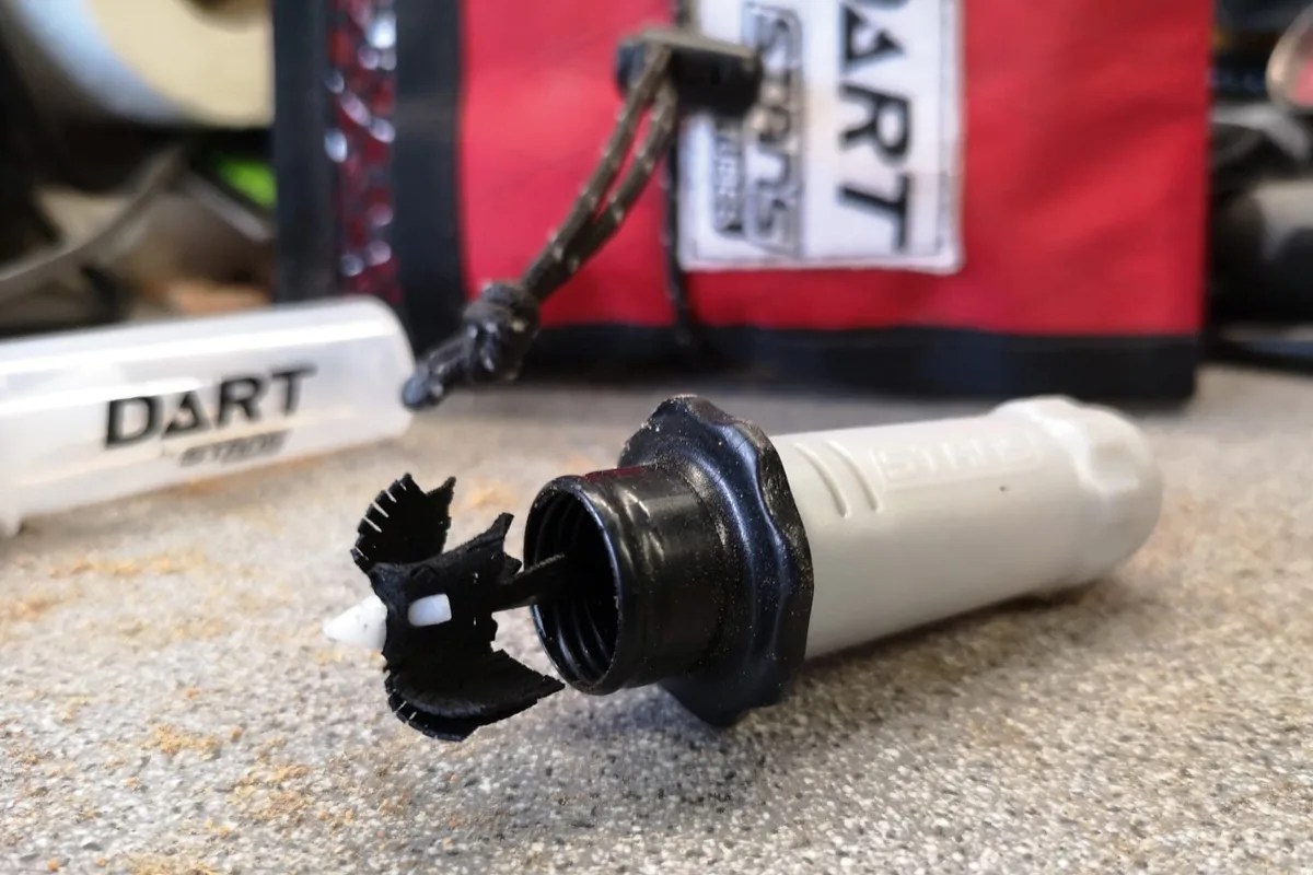 El DART el nombre viene de las siglas (Dynamic Anatomic Repair Tool) es un sistema de reparación tubeless de Stan’s que combina una herramienta compacta con “dardos” prefabricados. Estos “dardos” son pequeñas piezas de polímero moldeado con unos filamentos, que se introducen en la perforación y actúan junto al sellante para crear una reparación rápida y durable. El envase de la herramienta guarda varios dardos listos para usar y suele incluir, además, un desmontador vastago de válvula integrado para poder añadir más sellante si hace falta. El mecanismo es sencillo: extraes el objeto causante del pinchazo, insertas el dardo con la herramienta y lo dejas alojado. El sellante tubeless completa y asegura el cierre.