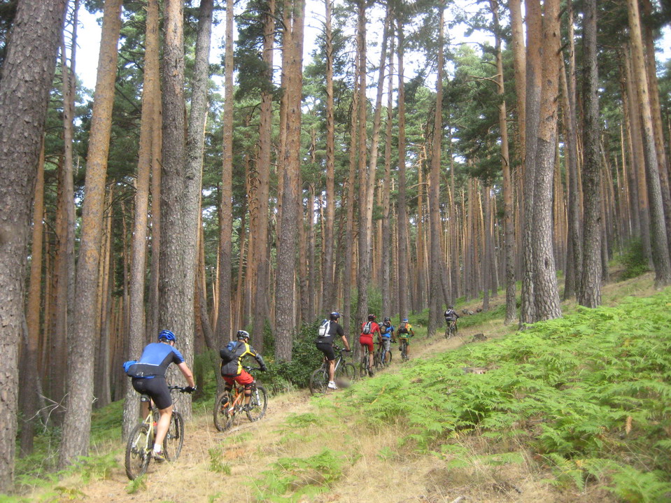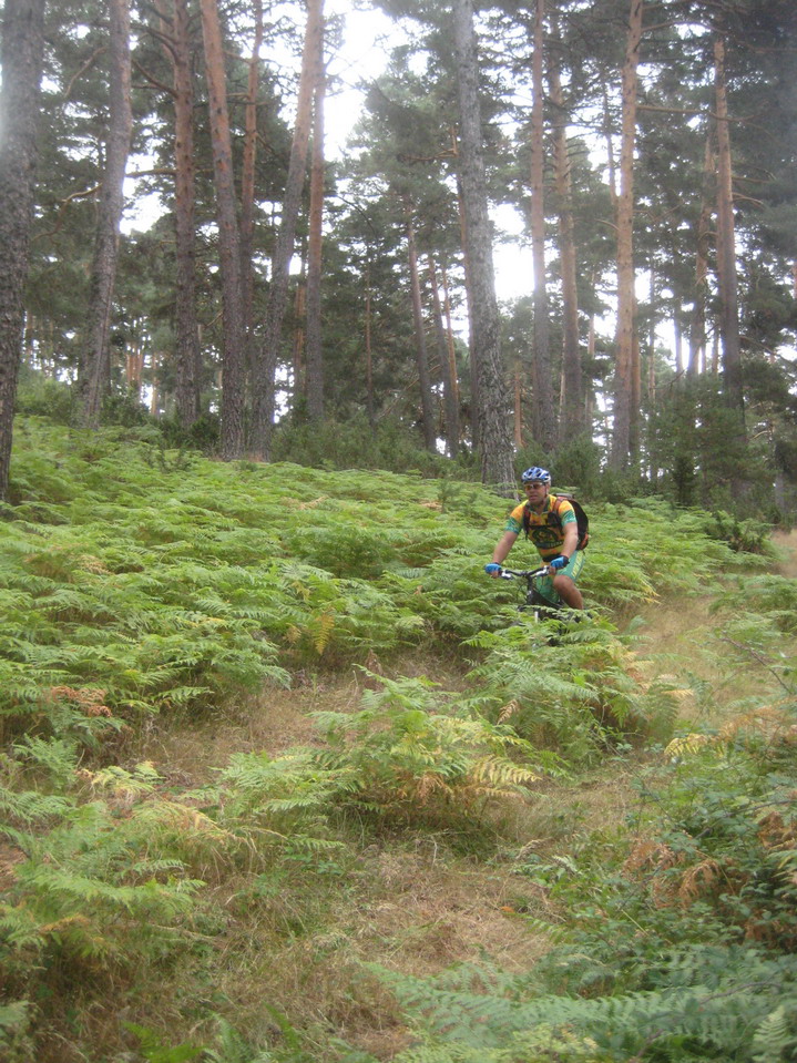 Llegamos al primer avituallamiento y ya no llueve, ahora toca bajar y disfrutar de los senderos de los arroyos y Valmayor, los hacemos en el sentido menos divertido y para colmo a la mitad nos encontramos con tres que van mu lento, incluso dos pasos los hacen andando, cuando es un sendero básico sin dificultad alguna, terminamos los senderos y nos metemos en la zona de las puertas rumbo hacia el Escorial, este tramo lo hacemos rápido, incluso vemos a uno que esta participando con transportín y chanclas, ole sus huevos. Llegamos al segundo avituallamiento, el tiempo mejora, se empiezan a ver claros y el calor delata que la tarde será soleada. Del Escorial hasta pillar la zona de senderos vamos por carretera, me descuelgo mucho de suguss y Jordán, intento pillarles por los senderos pero es imposible ya que me veo obligado a pasar a mas de 6 bikers en unos senderos sin espacio físico para entrar dos bicis, lo que me obliga a cambios de ritmo constantes, del final de los senderos hasta valdemorillo me pego un calentón de órdago para intentar pillar a mis dos compis, la sucesión de bajadas con subidas algo durillas me
