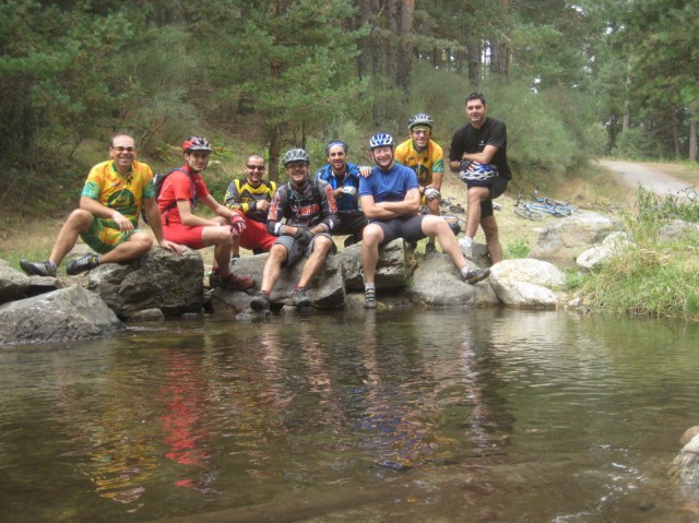 En el avituallamiento suguss me dice que ya empieza a pedir la hora y el último tramo lo hacemos pasando a gente pero a un ritmo más lento que el que teníamos durante la ruta La bajada a las Rozas es una sucesión de pequeñas subidas que la verdad joden un montón cuando ya estas a punto de completar, pasamos por debajo del puente y dibujamos una buena sonrisas, jajaja aún olía a kakita de bikers de secano. Pedro se adelanta y pide que nos hagan un foto a los tres entrando en meta.