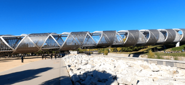 El siguiente puente que sale AA mi encuentro es de Arganzuela, una de las joyas modernas que se han creado para Madrid Río. Es obra del arquitecto francés Dominique Perrault, fue inaugurada en 2011.El diseño del puente consiste en una doble espiral de metal en forma de tirabuzón con dos brazos, recubiertos por una malla metálica que brilla durante el día y se ilumina por las noches recreando pájaros y mariposas en su interior.