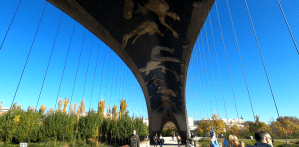 Los primeros que me encuentro son los que dan acceso al matadero y los invernaderos, también conocidos como los puentes gemelos, son como dos canoa invertidas de las que cuelgan sus tableros suspendidos por cables de acero a modo de barbas de ballena. En la cúpula de los puentes hay murales de personas flotando en el cielo creado a base de teselas de vidrio 6,5 millones nada menos que resulta realmente impresionante.