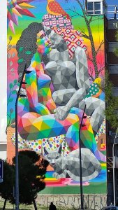 El nuevo mural de Madrid Río se realizó coincidiendo con las fiestas del Orgullo. Está realizado a base de figuras geométricas y gran uso del colores, nos muestra a dos mujeres de distintas culturas besándose a modo de mensaje mostrando el multiculturalismo de esta ciudad, la diversidad y el amor libre.