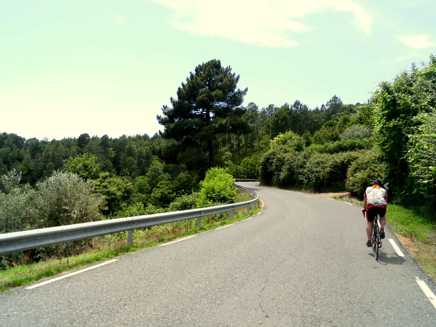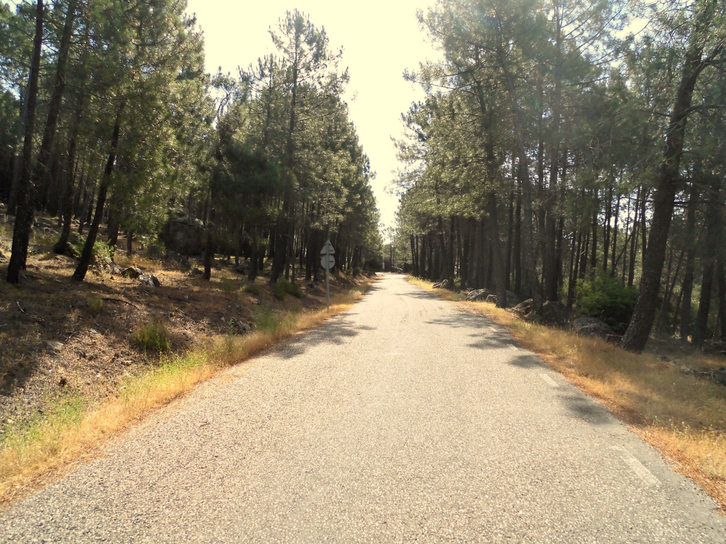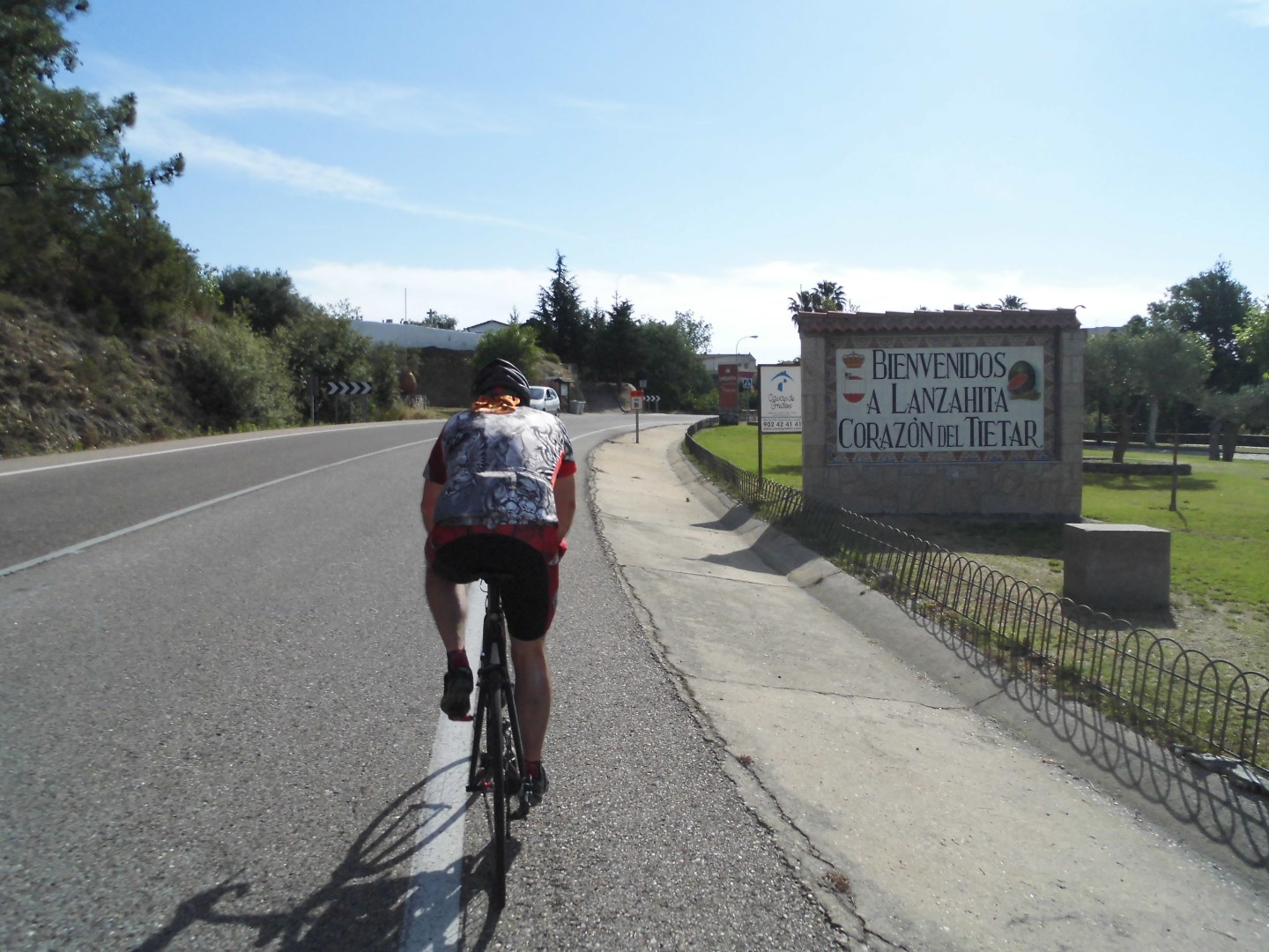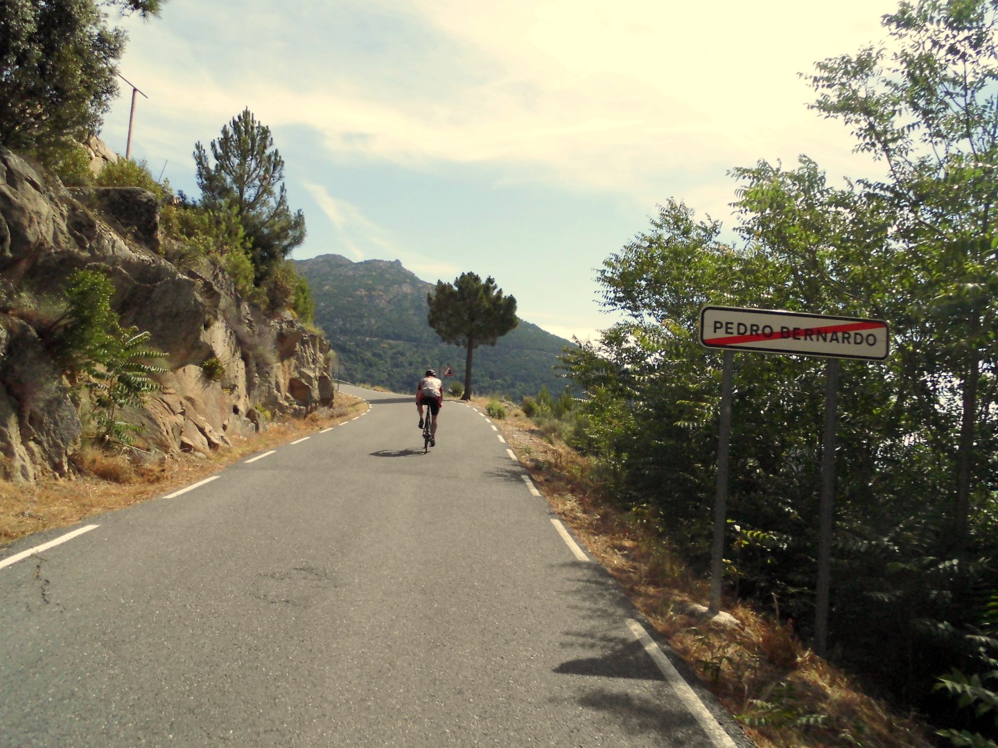 Tras el desayuno y unos kilómetros de precalentamiento llegamos a Lanzahita en donde a la salida del pueblo han puesto la subida hacia Pedro Bernardo, yo pongo mi relación de cambio preferida la de paso de semana santa y comienzo mi penitencia mientras veo como JJ se escapa cuesta arriba. Esta subida hacia el puerto es mucho más bonita que la que sale desde la carretera y sube al pueblo de Pedro Bernardo directamente, da la sensación de ser una vieja pista forestal asfaltada que asciende por entre un pinar y con un tráfico casi nulo que te permite durante muchos momentos sentir las mismas sensaciones que si ascendieses con tu bici de Mtb. Mientras estoy afrontando un tramo de gran pendiente veo bajar muy lento un viejo Seat panda conducido por un orondo viejecillo que con una media sonrisa de las de quijada para dentro sacude su mano como diciendo “no va sufrir na”, me rio y pienso que será una venganza del karma por cachondo.